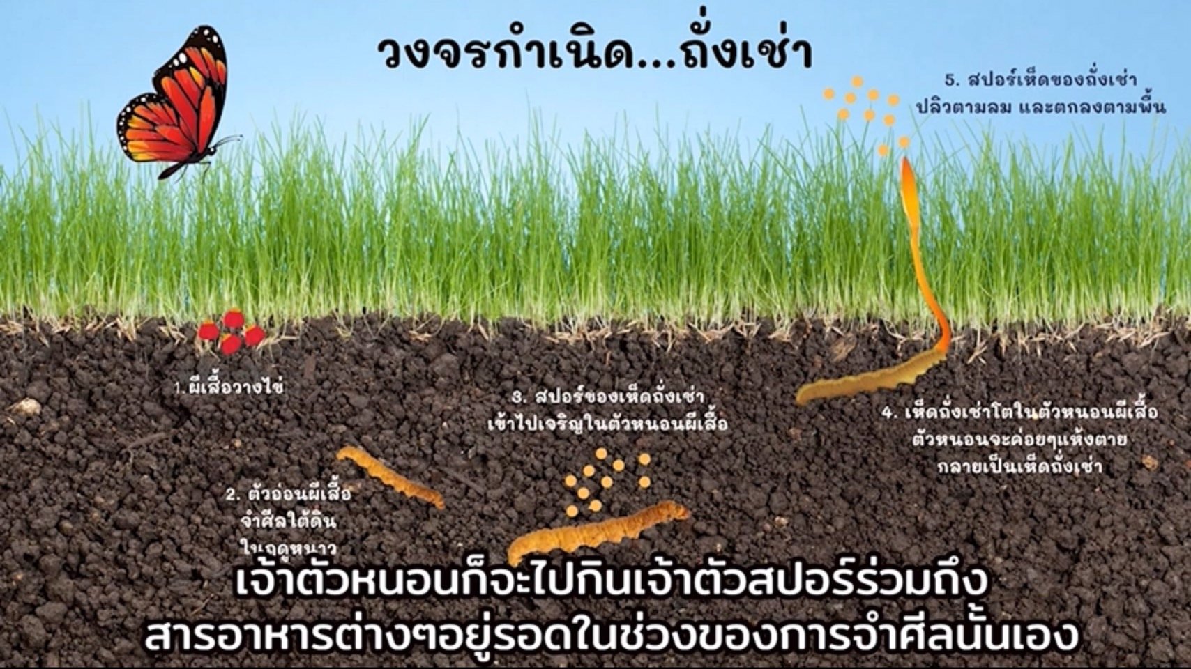 ส่วนเห็ดถั่งเช่าเขาจะทำการสลัดสปอร์ทิ้ง เจ้าตัวสปอร์จากเห็ดถั่งเช่าเองก็จะตกลงสู่พื้นดิน เจ้าตัวหนอนจะกินเจ้าตัวสปอร์รวมถึงสารอาหารต่างๆ เพื่อทำให้ตัวเองอยู่รอดในช่วงของการจำศีลนั้นเอง และเมื่อเริ่มเข้าสู่ฤดูร้อน สปอร์ก็จะเริ่มเจริญเติบโตและแย่งสารอาหารและแร่ธาตุจากตัวหนอน ทำให้ตัวหนอนค่อยๆตายลงจนกลายเป็นหนอนถั่งเช่านั้นเอง